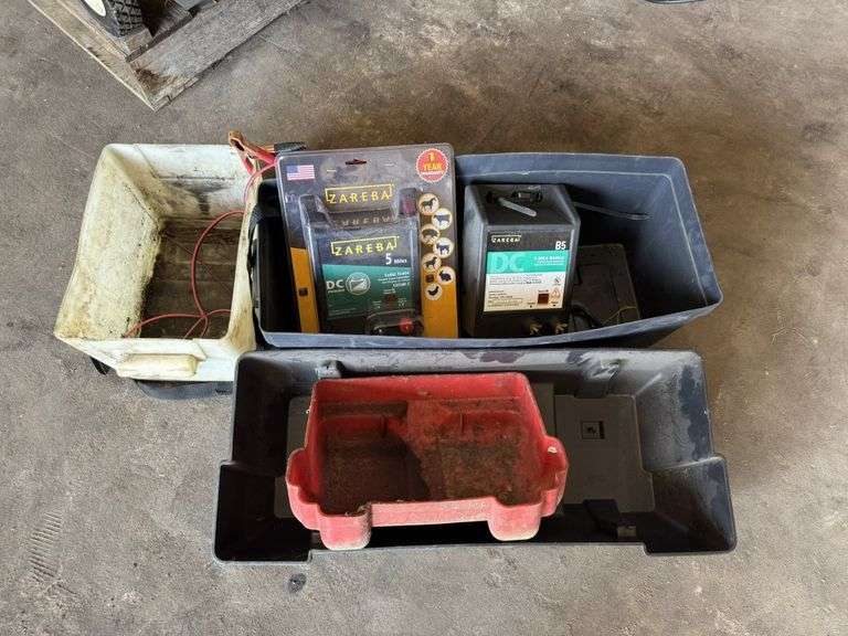 ZAREBA 5 MILE DC FENCE CHARGER (2), 1 NEW IN PACKAGE, BATTERY BOXES (2)