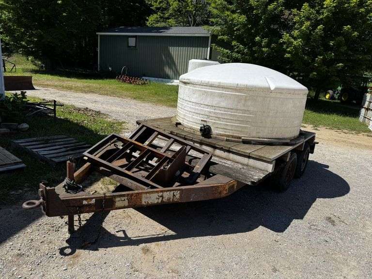TANDEM AXLE TRAILER WITH 1000-GALLON POLY TANK, PINTLE HITCH, RAMPS CURRENTLY OFF, SELLS WITH REGISTRATION, HAS 2 TIRES THAT DON'T HOLD AIR